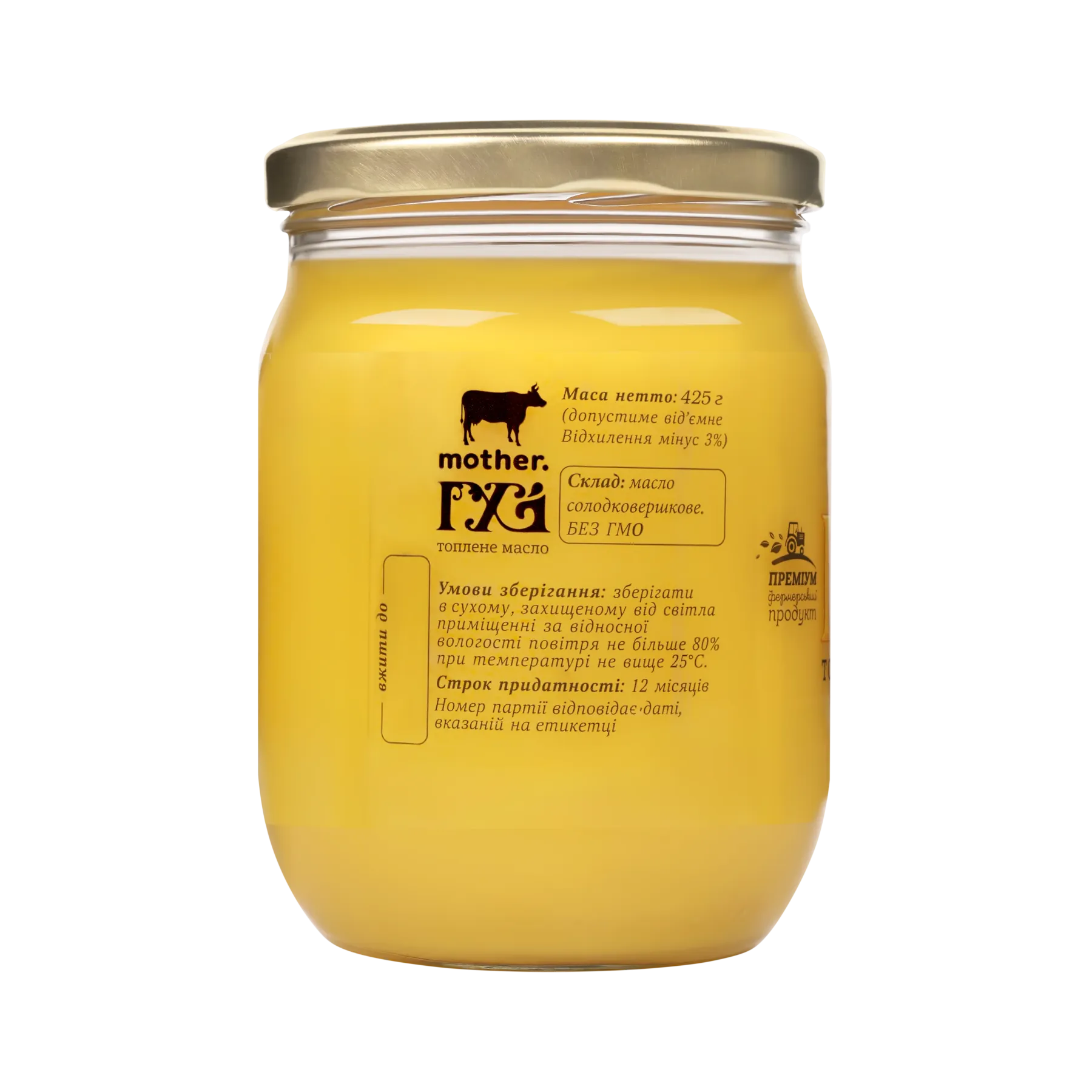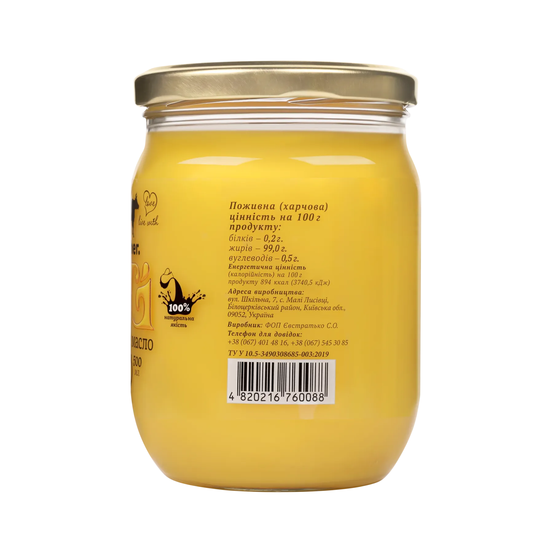 Продукт створений шляхом повільного витоплення вершкового масла екстра 85% жиру на живому дров’яному вогні,